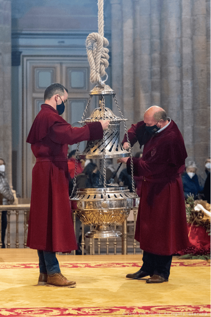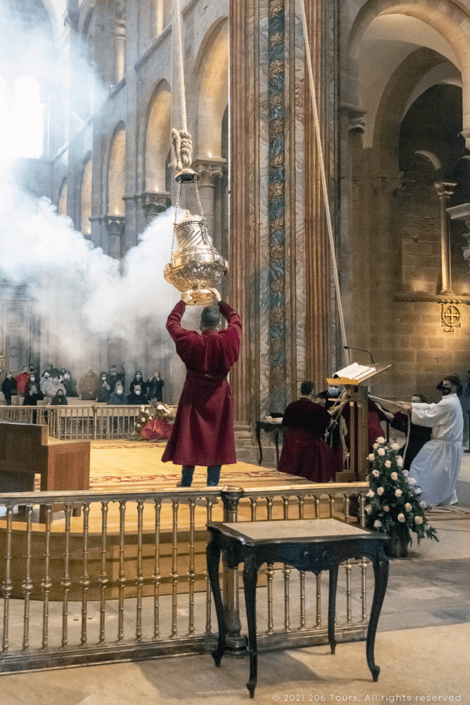 See stunning exclusive photos of the renovated Santiago de Compostela Cathedral and Botafumeiro, below. The Botafumiero is a thurible that is used to burn and disperse incense and is suspended from the roof of the church and swung by eight men called the tiraboleiros.
