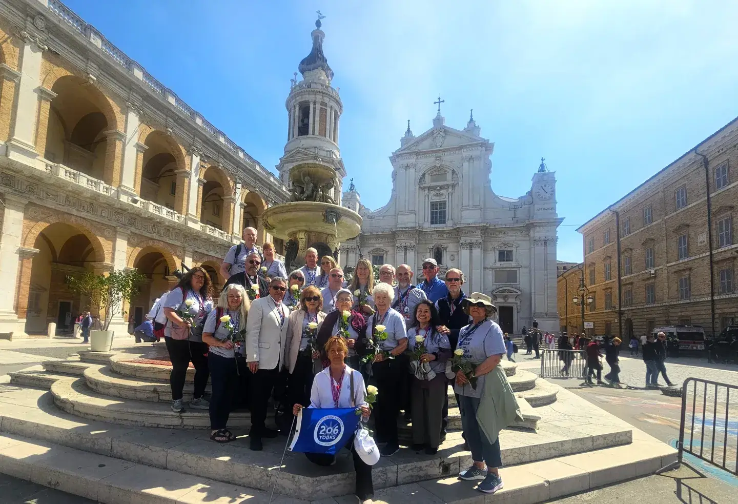 ANGELIC MOMS: 206 Tours pilgrim Moms holding white roses on Mother’s Day, May 11, 2025, during their pilgrimage to the Basilica of the Holy House of Loreto. (Photo Credit: Marissa Romero)