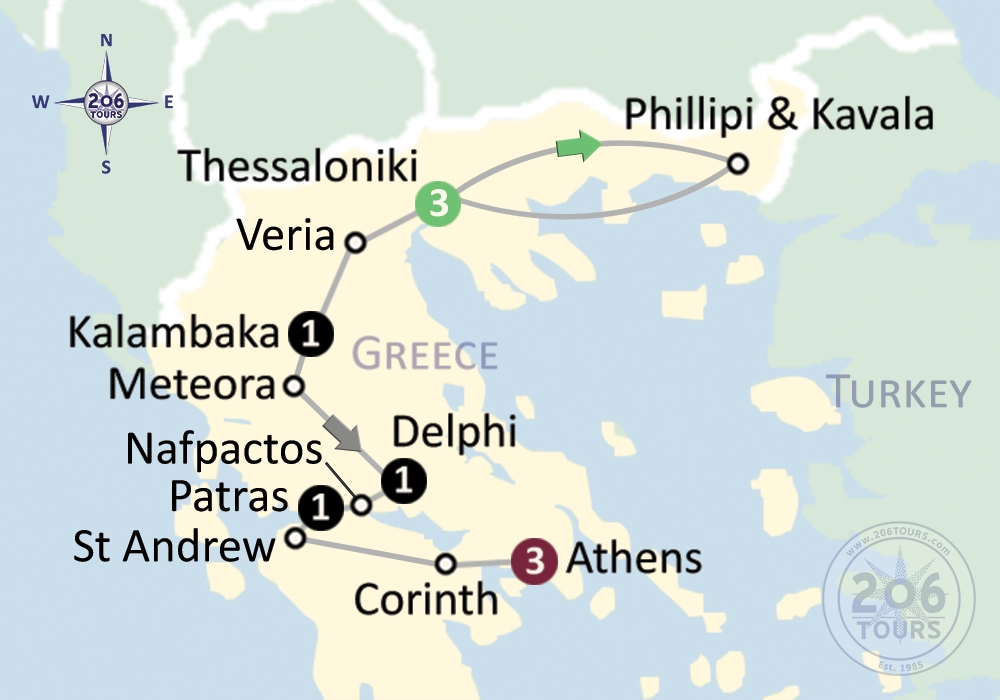Start your day with breakfast at the hotel. In the winter of 49-50 A.D., Saint Paul wrote two epistles to the Thessalonians. These letters urged Christians to “live blamelessly” and to refrain from living idly while they wait for the second coming of Christ. While in Thessaloniki, you will witness several ancient artifacts, such as the triumphal Arch of Galerius found at the start of Via Egnatia. Due to the convenient location, this arch was once a strategic artery of the Roman Empire and constructed to honor the Roman Emperor Galerius following the Roman victory over the Persians. We also see St. Demetrios Church with its valuable mosaics and frescoes and from here we walk to view the Roman Agora, a place St Paul was preaching. Then drive to the upper town which offers a marvelous view of the city. We drive through the modern church of St Paul and reach the site where the Monastery of Vlatadon was built and is believed to be the location where Jason’s house once stood and where St Paul was accommodated during his visit to Thessaloniki. Following the city-tour we drive to VERIA (Berea). According to historical resources, Paul the Apostle had visited Veria at least twice between 50 AD and 57 AD in order to teach the life of Jesus to the people of the region. The Apostle of the Nations was warmly welcomed since his first visit and his preaching had a great impact on the Verians and the Jews.
