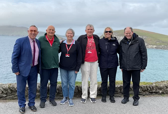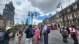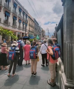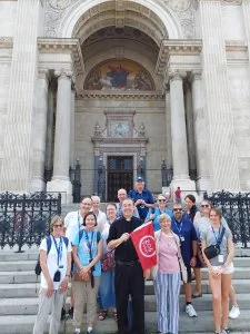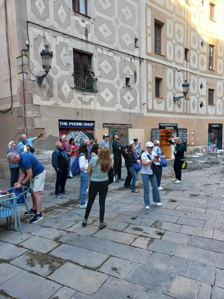 - Pilgrimage: Pilgrims listening to a guide in a square in Barcelona, Fr Scanlan group