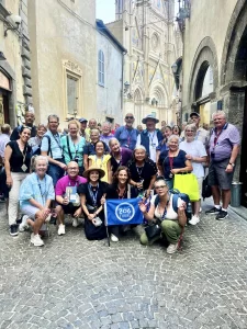 - Pilgrimage: Group of pilgrims on a bridge in Florence. Faith & Food in Italy