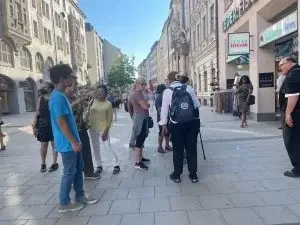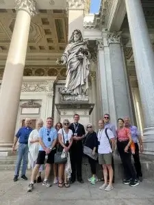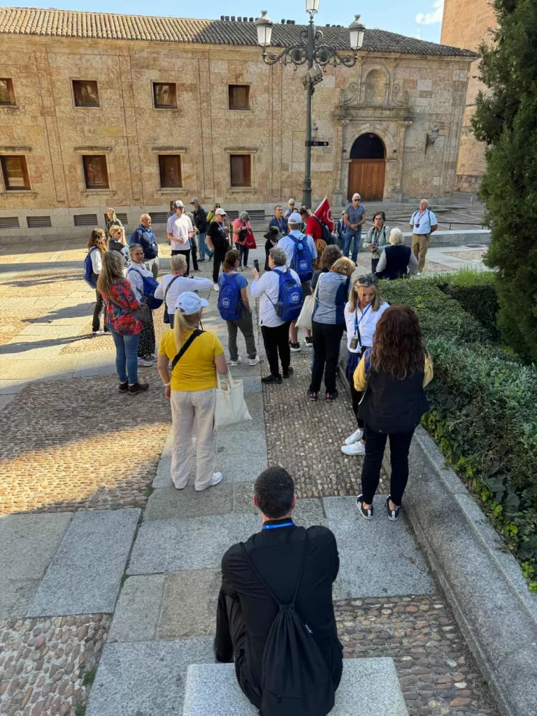 Pilgrimage: Pilgrims listening to a guide in a square in Barcelona, Fr Scanlan group
