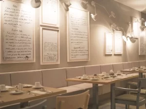 From a serene white and pale grey dining room to giant moon-shaped lampshades and playful variations of black and white artefacts, the calming, cutting edge aesthetic greets you quietly and confidently wherever you wine and dine with us.