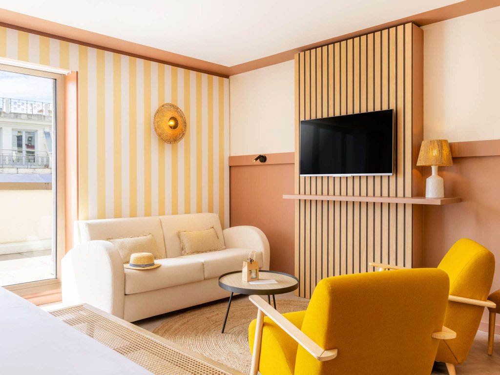 Choose comfort with our modern room, fully-equipped to ensure your relaxation and well-being: king-size bed and sofa bed (47″ [120 cm]), air conditioning, tea and coffee making facilities and bathroom with rain shower.