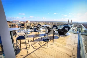 Our cosy indoor space and outdoor terraces with panoramic views over the city are the perfect place to meet up and enjoy a drink accompanied by a plate of tapas or even a delicious Brussels waffle for your sweet break. SKYBAR 360 welcomes you every day from 3pm for your gourmet moment, then at 5pm for cocktails and tapas. Whether you’re staying at the hotel or just passing through, we look forward to welcoming you.