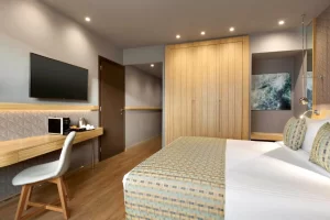 The Standard Double or Twin Atrium View room features a king-sized bed or twin beds, a functional working desk with Espresso machine and a spacious bathroom with luxurious bathroom amenities. Pillowtop mattresses and Egyptian cotton linens offer a comfortable, good night’s sleep and a free Super-Fast Wi-Fi keeps you connected. Select your favorite TV Satellite Channel in the LED LCD TV 43”while enjoying our in-room special dining options.