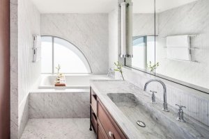 Includes two bathrooms, each with a bathtub, separate shower and Carrara marble tiles.
