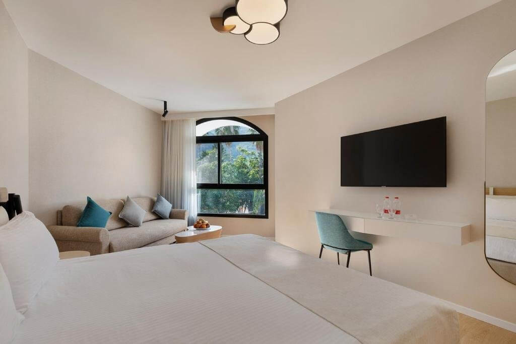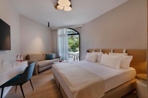The new hotel room has a parquet floor and is equipped with a luxurious double bed next to a sofa bed that can accommodate up to two children.