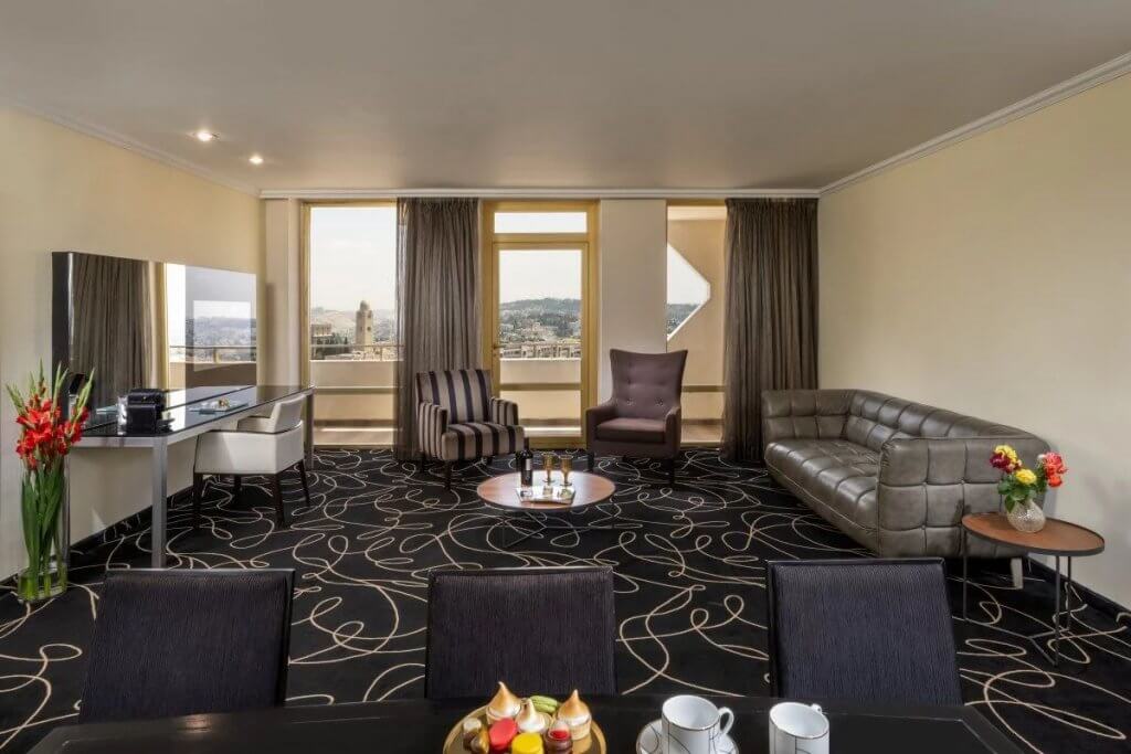 The elegant suite has a balcony overlooking the Old City. Guests of the suite will enjoy VIP treats such as a daily newspaper on weekdays. The suite has a Shabbat clock
