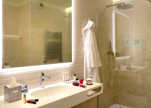 With its large size this completely renovated room ensures maximum satisfaction even to the most demanding of customers. With high quality furnishings, the room includes a living room area with an elegant three-seater sofa, a pleather armchair, spacious designer wardrobes, a fine carpet, a technological system for managing the lights in the room. The room is also equipped with sound-absorbing PVC floor with wood effect finish, super king size double bed with comfortable and new mattress, 55″ smart TV, Chromecast, 1000 Mbps optic fiber Wi-Fi connection, bathrobe and slippers, kettle and Nespresso coffee machine with selection of coffees. The large bathroom with a comfortable and spacious shower is decorated with luxurious and modern furnishings and equipped with an exclusive courtesy line.