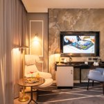 New spacious rooms, distinctly furnished in a modern style. The rooms are equipped with sound-absorbing PVC floor with wood effect finish, living room corner, super king size double bed, with comfortable and new mattress, 49″ smart TV, Chromecast, 1000 Mbps optic fiber Wi-fi connection, bathrobe and slippers, kettle and Nespresso coffee machine with coffee selection. Modern bathroom with spacious shower, exclusive courtesy line.