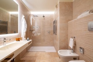 Brand new completely renovated rooms, modern, elegant and quiet, located on the top floors of the Hotel, with a breathtaking view over the center of Bologna. All with sound-absorbing floor in PVC wood effect finish, equipped with Super king size double bed, with new comfortable mattress, kettle with tea and infusions, Nespresso machine with coffee selection, bathrobe and slippers, 49″ smart TV, Chromecast, 1000 Mbps fiber optic Wi-Fi connection. Bathroom completely renovated with modern furnishing accessories, equipped with a spacious shower, backlit mirror and courtesy line.