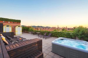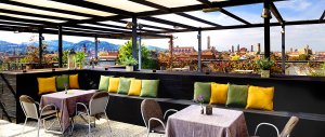 The terrace on the seventh floor of the AEMILIA HOTEL offers guests a unique view over the rooftops of the center of Bologna, with an impressive vista of the city, starting from San Luca hill, moving towards the two towers and up to the university district.