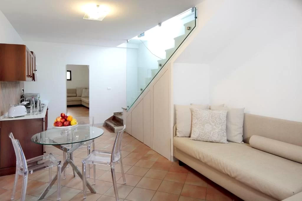 Apartment on a single mezzanine floor with private entrance from the garden, with a living area consisting of a sofa, TV, dining table, kitchenette and large window overlooking the surrounding countryside, double room, double/twin and bathroom with shower.
