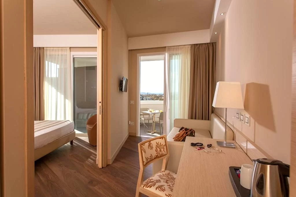 New Executive Sea View rooms: elegance and metropolitan style. Elegant and harmonious design. King Size double beds, sofa bed, equipped with double pillow and soft comforter. Fine fabrics that echo the typical Romagna tradition. Environment enhanced by natural light and views of the Rimini Sea.
