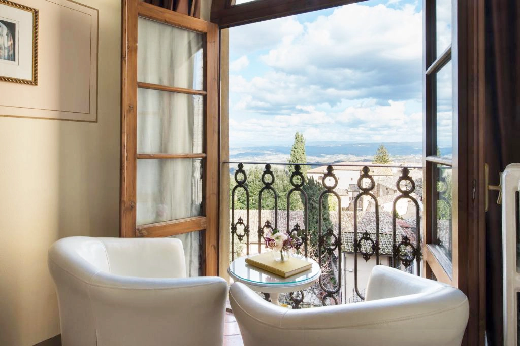 This large, elegant room overlooks the medieval square, the internal courtyard or the valley. Includes free WiFi and a flat-screen satellite TV. Some also have a spa bath.