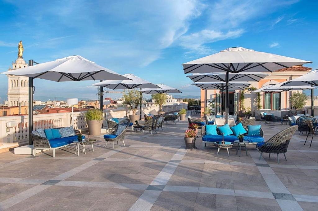 The hotel’s 177 rooms are decorated with elegant Italian style, all featuring our large, comfortable “Sleep Better” beds. Housed in an historical building, once the headquarters of the National Railway Company, the hotel was completely renovated in 2015, giving it a modern feel. All rooms have free Wifi, large flat-screen TVs and drinks facilities including a Lavazza coffee machine. Some rooms have views over the gardens and ancient ruins of Mura Serviane; while others offer stunning views over the city.