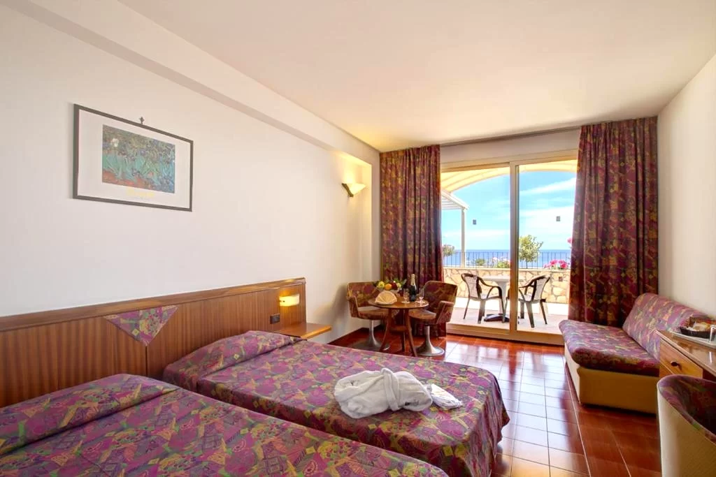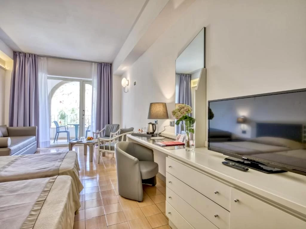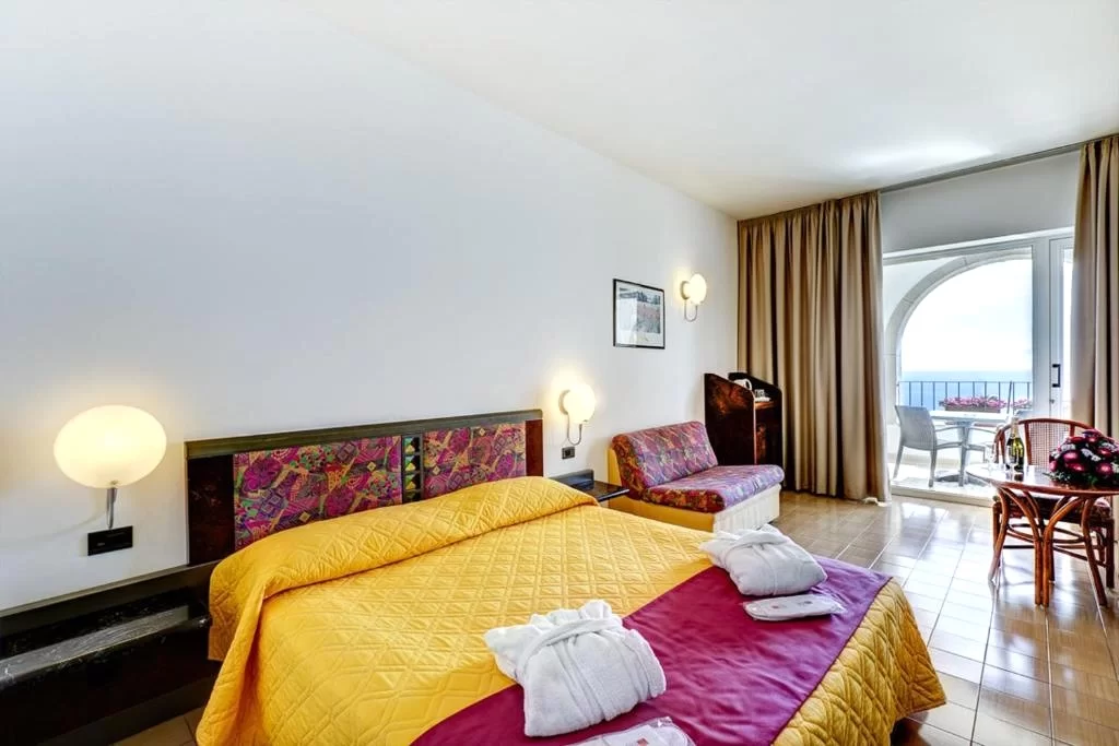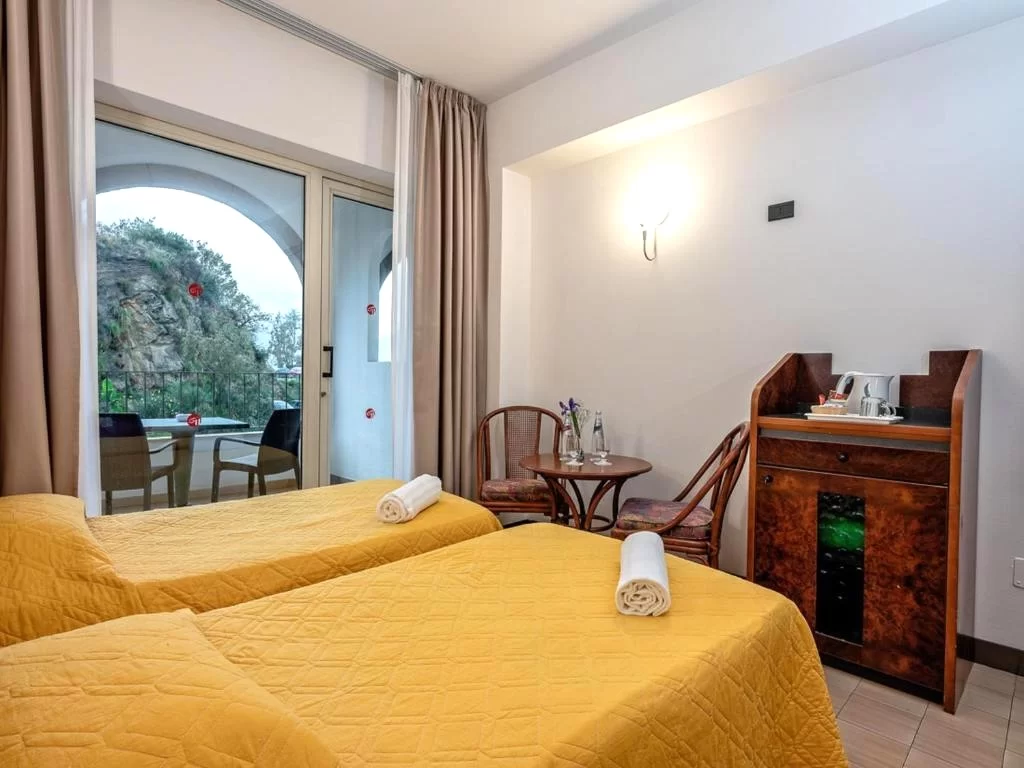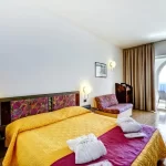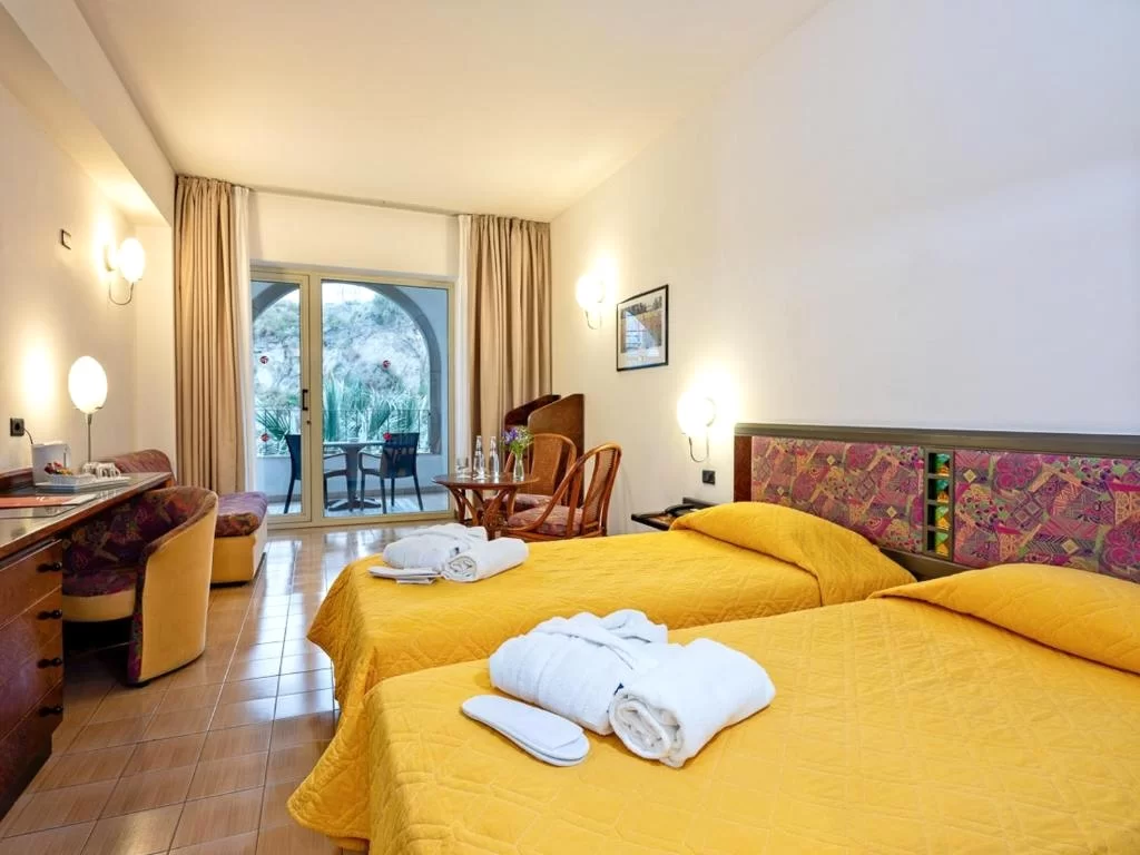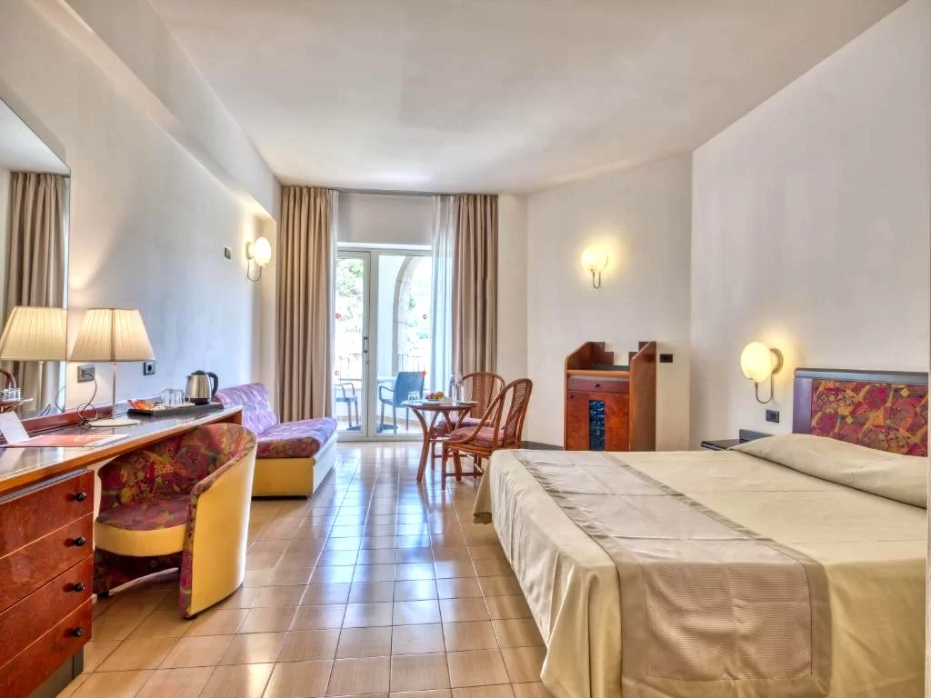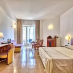 The room is located in Le Terrazze, with ensuite bath or shower and hairdryer and offers telephone, sat.TV, minibar, safety deposit box, tea & coffee maker, air conditioning (available during hot season and at Management’s discretion), balcony or a small terrace with table and chairs overlooking the inner garden or the hill.