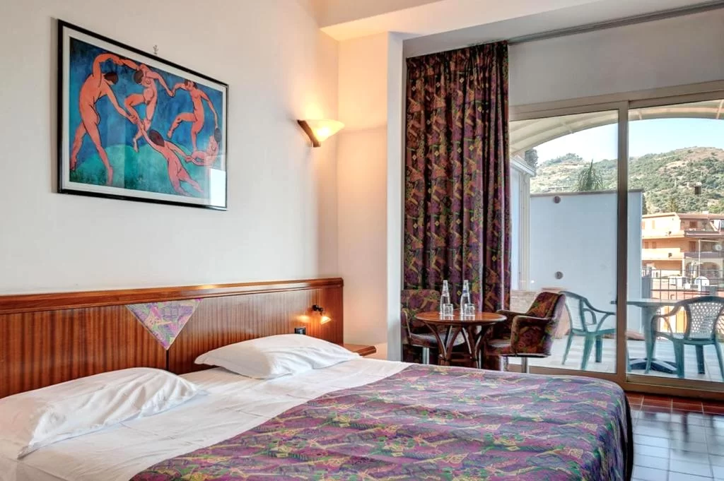 The room is located in Olimpo (or Belvedere), with ensuite bath or shower and hairdryer and offers telephone, sat.TV, minibar, safety deposit box, tea & coffee maker, air conditioning (available during hot season and at Management’s discretion), balcony or a small terrace with table and chairs overlooking the sea, reaching Capo Sant’Alessio and Taormina Bay.