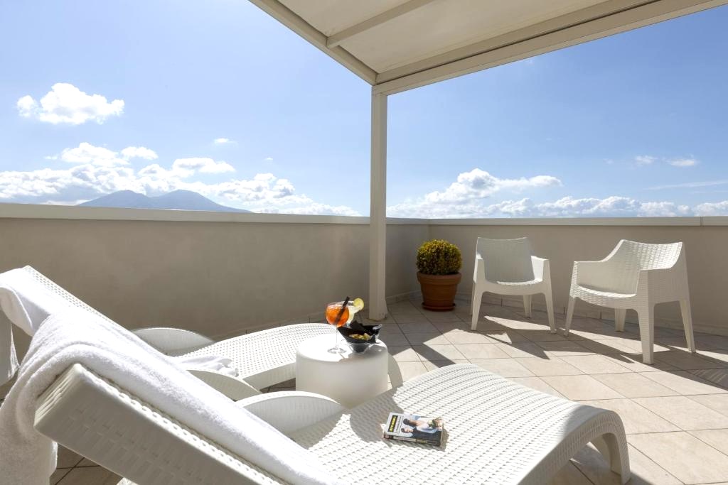 The wonderful Junior Suites are spacious and have bright terraces with a view of the Vesuvius or overlook the roofs of the old town centre. All rooms, which feature modern furnishings and are fully soundproofed, have: living area with sofa, LED TV with free satellite channels, en-suite bathroom with shower/bath tub and hairdryer, independent air conditioning, minibar, telephone, safe, bathroom towels and complimentary toiletries.
