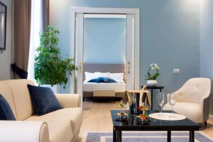 The rooms on the fifth floor vary in size: from over 323 ft² (30 m²) to 377 ft² (35 m²); the terraces are smaller but the view is nicer; the bathrooms are all with large showers. Each is different from the other but all are spacious, bright and beautiful for comfortable and relaxing stays. Large double bed.