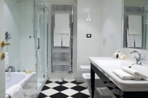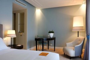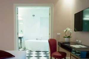 This is Turin Palace Hotel’s historic Executive Suite located on the first floor; the room with a small balcony, has a large bathroom with separate tub and shower and a very comfortable walk-in closet.