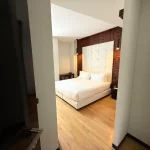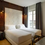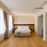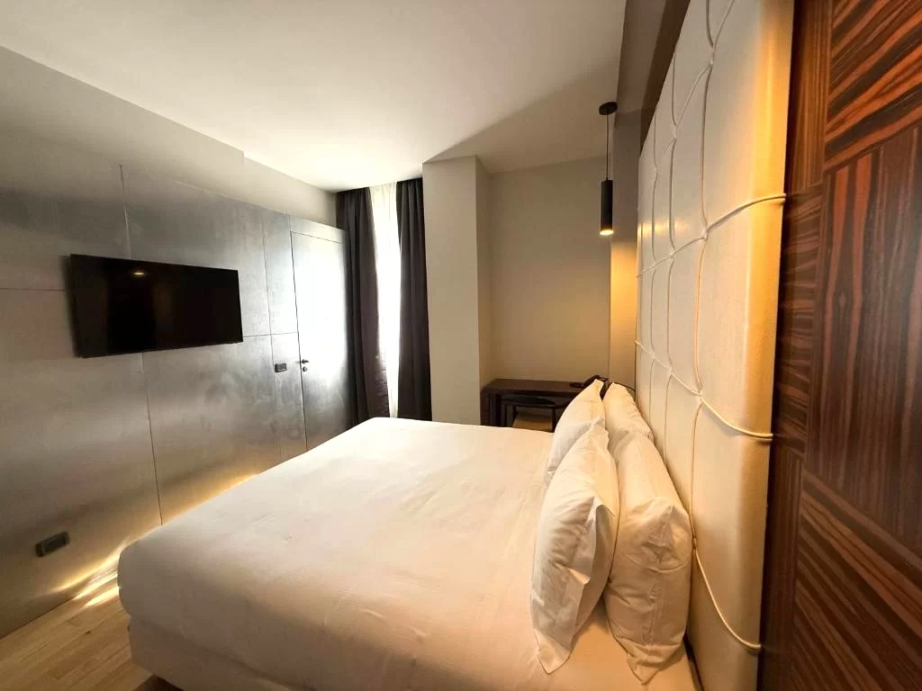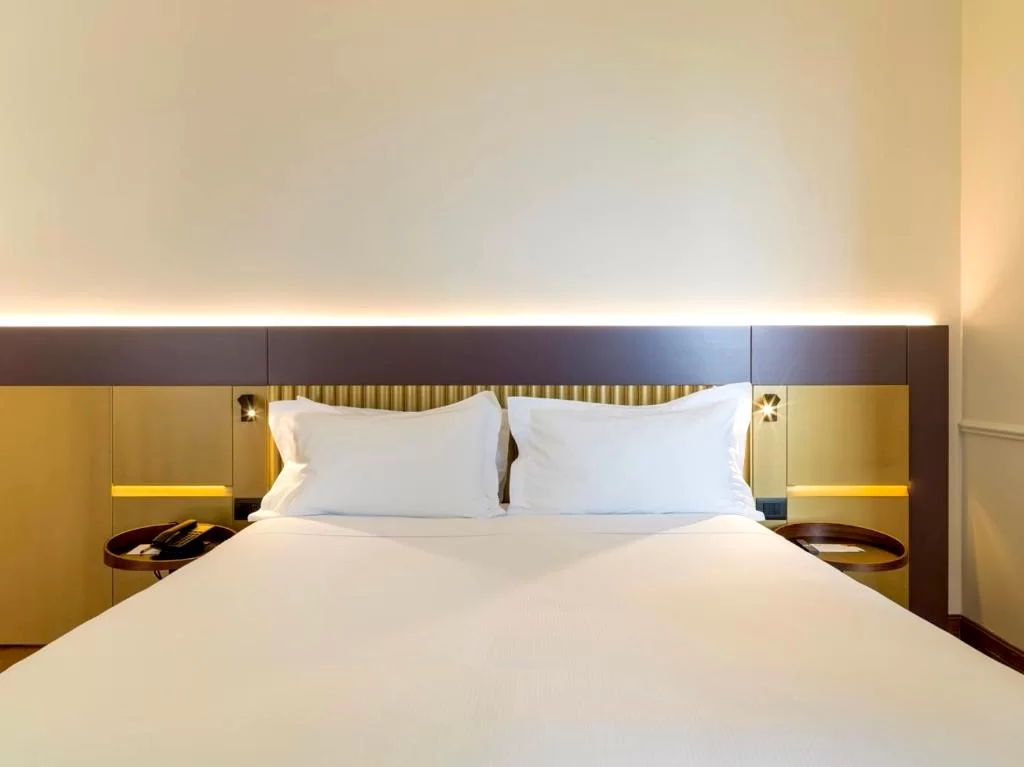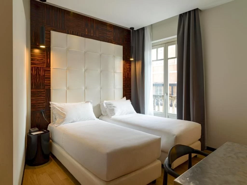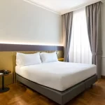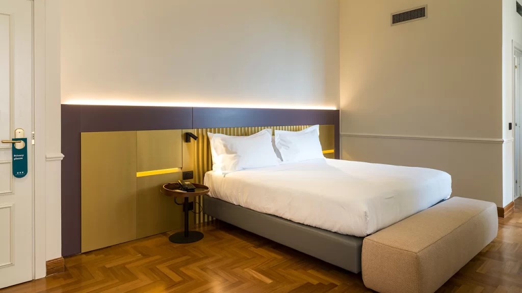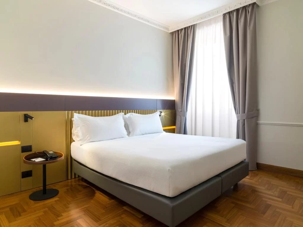 55 rooms spread across two buildings connected by a surface tunnel. All rooms feature parquet flooring, a laptop-sized safe, a minibar, climate control, and a vanity mirror.