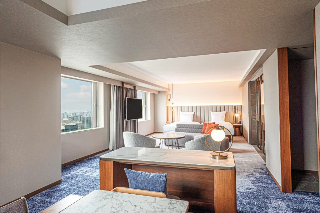 Rooms at ANA Crowne Plaza have wood furnishings, elegant colors and extra-long beds. Each includes a flat-screen TV, and a bathroom with a bathtub and bathrobe. 24-hour room service is available.