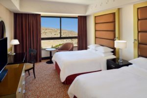 Enjoy one of the Seven Wonders of the World, the ancient Nabatean city of Petra carved from the rock over a thousand years ago. Embracing traditional hospitality and overlooking Jordan’s timeless wonder, the Petra Marriott Hotel offers anticipatory & traditional service designed to exceed all expectations. The hotel is a haven for comfort and luxury. Almost all the spacious rooms have spectacular views of the valley. There are several culinary choices such as Dushara Restaurant where you can start your day with an elaborate breakfast buffet or enjoy Middle Eastern specialties for lunch or dinner and L’Affresco, the Italian restaurant where you can feast on homemade pizza and pasta. For relaxation, you can swim in the outdoor pool and enjoy the breathtaking views of the Petra Mountains or rejuvenate your body with a Turkish bath, sauna or massage. For a banquet or special event, you couldn’t find a finer choice as the hotel also features 1,790 ft² / 166 m² of event space overlooking the Petra Mountains.
