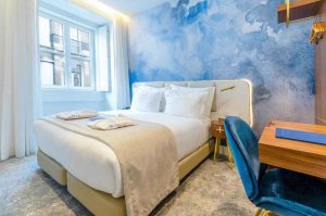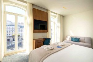 These rooms include a Queen size bed or Twin beds. Rooms with view to the Jardim do Regedor Street or Praça dos Restauradores, where some of them have a balcony. Maximum occupancy is 2 adults or 1 adult and 1 child. Rooms equipped with a minibar, a 4K TV and Bluetooth Marshall speaker. Room size 16 Square meters, 172 Square feet.