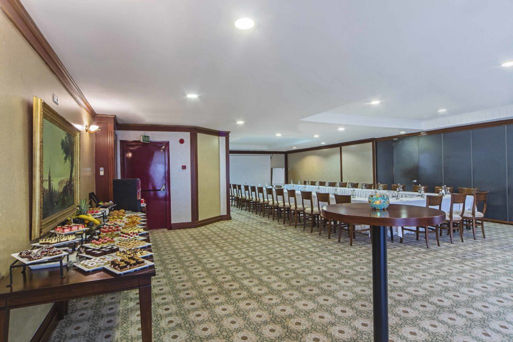 Our ballroom and meeting rooms are designed as full-service approach for the Corporate guests meeting, training, seminars, conferences, and also weddings, party organizations. Our meeting rooms, from 1,076 ft² / 100 m² ranging from 4,306 ft² / 400 m² sizes with superior technical equipments and two of three meeting rooms with the total daylight has an ideal features for the business meetings, training seminars, conventions and conferences. You will find all the office supplies you will need in full and you will be able to use the Internet access, digital screen, remote projector unit and additional technical equipment.