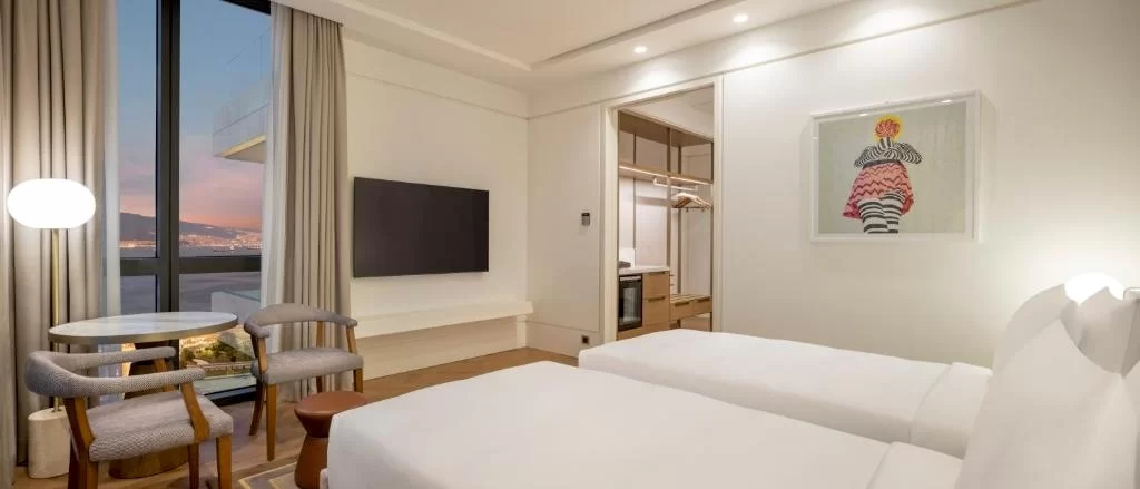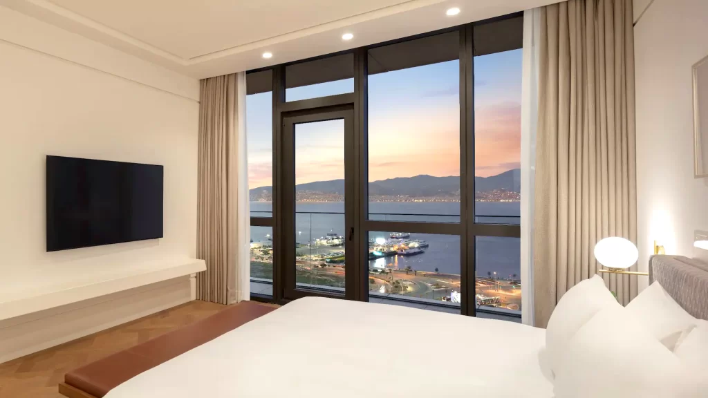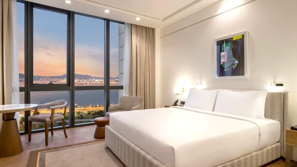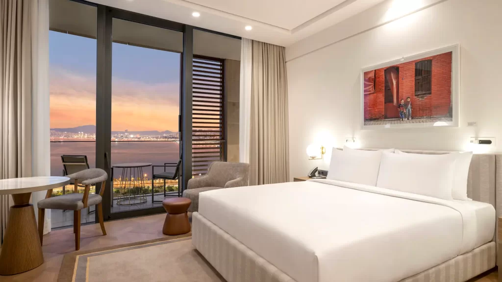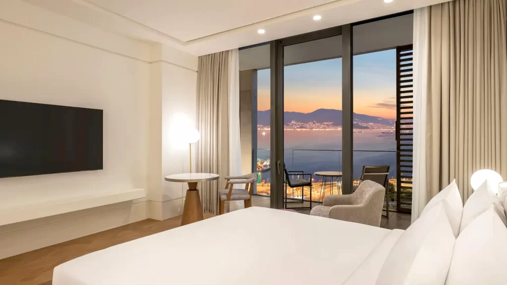 Unwind in this spacious room featuring a private balcony overlooking the Gulf of İzmir. Located on the higher floors, this room includes a plush king bed, a work area, a walk-in rain shower and a full marble bathroom.