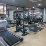 A small onsite fitness room with 4 cardiovascular machines and weightlifting area