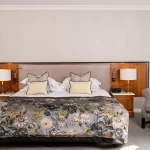 Our Suite at the Everglades Hotel is peak luxury, with guests relaxing in a super kingsize bed with spacious living area which includes seating and dining areas.
