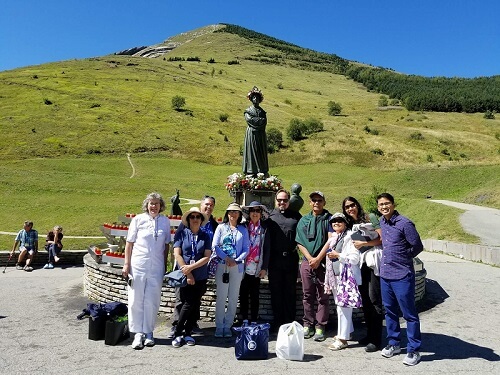 Thank you so much for your email. The Shrines of Italy pilgrimage was absolutely wonderful and I thank 206 Tours for all of your efforts to provide such a meaningful experience for me, as well as my fellow pilgrims. This is the third pilgrimage I have taken (the first was for the canonization of St. John XXIII and St. John Paul II and the second was for the canonization of St. Teresa of Calcutta), and have found each to be a beautiful, unique experience. This pilgrimage was at a time of fewer crowds so I was able to enjoy some of the sites in a more thorough way than during the last two pilgrimages. Our tour guide, Tony, was exceptional. He was extremely organized and made sure that we were on time for all of our tours and events. He was also good at taking care of everyone on the tour and making us feel that we were part of a family while were on our pilgrimage. He was always smiling and full of joy and definitely enhanced the experience. All of the local guides were lovely and provided great background and insight for each area that we visited. My friend Cynthia and I had a small glitch at the beginning of our tour when the transfer that was arranged was not at the airport, but it was taken care of quickly by your staff and Tony, which was much appreciated. The hotels and restaurants were excellent as well. Tony did a good job in giving direction to us for lunches, which was appreciated. Our priest, who had to fill in at the last minute due to the illness of the original priest accompanying the tour, was lovely and humble. He provided beautiful homilies and spiritual guidance throughout the pilgrimage. It was a blessing to have daily Mass, particularly in St. Peter’s and other significant churches, and I hope to be able to continue that practice now that I am back home. I have attached a photo from Monte Cassino, which was one of my favorite stops on the pilgrimage, and a photo of our group (taken at dinner in Assisi). Thank you again for a wonderful pilgrimage experience.
