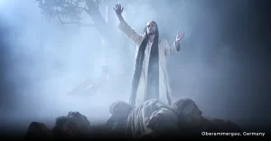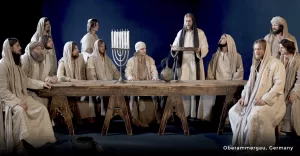 What makes this performance so extraordinary is how the Stage truly comes alive! Not only in the decoration of the Set and the performance of the Actors, but with real animals and birds playing under the open sky. There are thirty-six (36) main actors who are dressed in white costumes, with their supporting cast dressed in greyish blue. The actors do not wear makeup, as that is their natural hair. Every scene is real, and live, so for example: the actor who is tied to the cross has to stay in that position for more than one (1) hour In between each scene, there are “Living Tableaus”, where the live actors perform intricate sets of the Old Testament. You can never describe the feeling you get, as you see these stories being performed right in front of you.