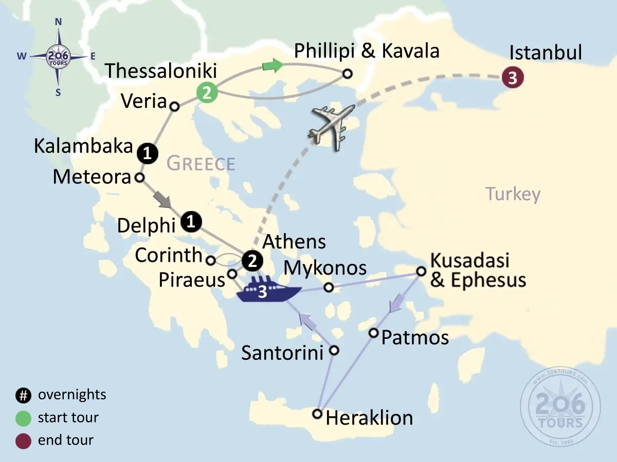 - ~ 3 nights: Celestyal Discovery Cruise Ship, Athens, Greece (outside cabin with picture window)