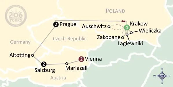 On your last day of touring Krakow, after breakfast, depart for your excursion to Lagiewniki, the capital of the Divine Mercy. Through the mediation of St. Faustina, Christ passed on the message of Divine Mercy at Lagiewniki. While here, you will have the opportunity to visit the Shrine of Divine Mercy, which contains images of the Merciful Jesus, relics of St. Faustina, as well as the Saint’s convent chapel and her Tomb. Visit and celebrate Mass at the Shrine of Divinity, which was visited by Saint John Paul II in 2002. Following Mass, you will have the opportunity to pray by a relic of Saint John Paul II. Continue to Wieliczka and visit Europe’s oldest salt mine, which has been listed by UNESCO as a World Heritage Site. Return to Krakow for your farewell dinner and overnight stay in Poland.